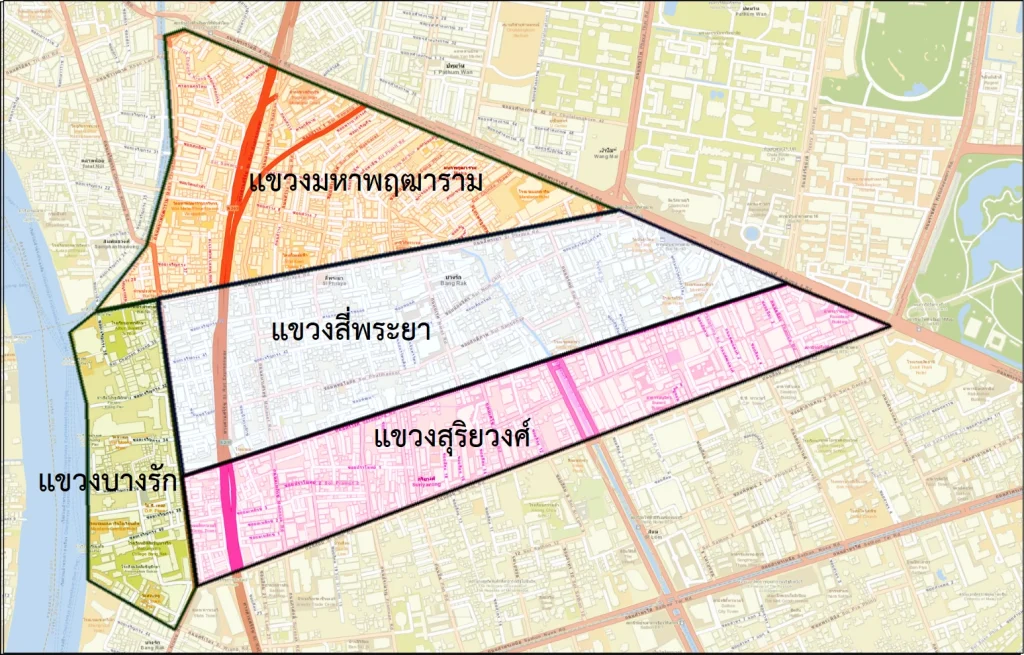 (แขวงสี่พระยา,แขวงมหาพฤฒาราม,แขวงสุริยวงศ์ และแขวงบางรัก)